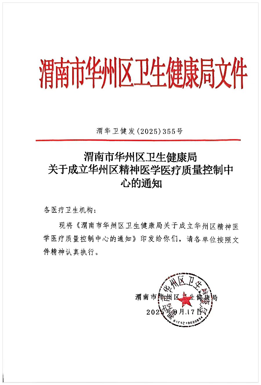 在渭南市华州卫生健康局及华州区医疗质控中心的支持下,12月9日,渭南市华州区精神医学质量控制中心成立大会在我院顺利召开,标志着我院精神医学诊疗质量管控迈入规范化、精细化发展新阶段。局领导、质控中心领导、院领导、特邀专家、相关职能科室负责人、精神医学科医护骨干代表等参会,共同擘画精神医学质控工作新蓝图。