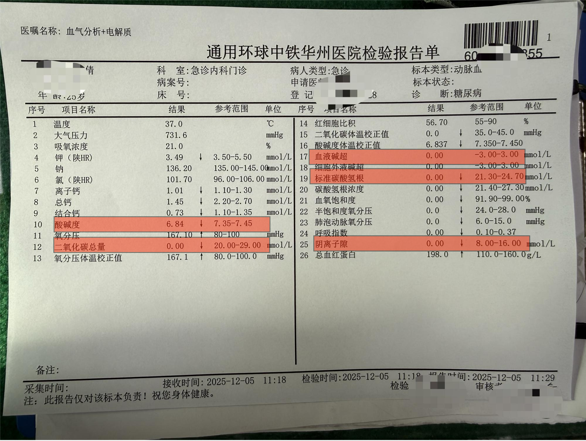 患者入院时精神萎靡,呈现典型的“深大呼吸”(库斯莫尔呼吸),呼出气体带有明显的烂苹果味(丙酮气味)。急诊检查结果显示:随机血糖高达25.7mmol/L(正常餐后两小时血糖应低于7.8mmol/L);血气分析提示血液酸度已达危急值(pH 6.84,正常值7.35-7.45),碱超与碳酸氢根指标严重低于检测下限;血酮体(β-羟丁酸)高达8mmol/L(正常<0.3mmol/L);尿酮体4+。这些指标明确指向了糖尿病急性严重并发症——糖尿病性酮症酸中毒,随时可能危及生命。